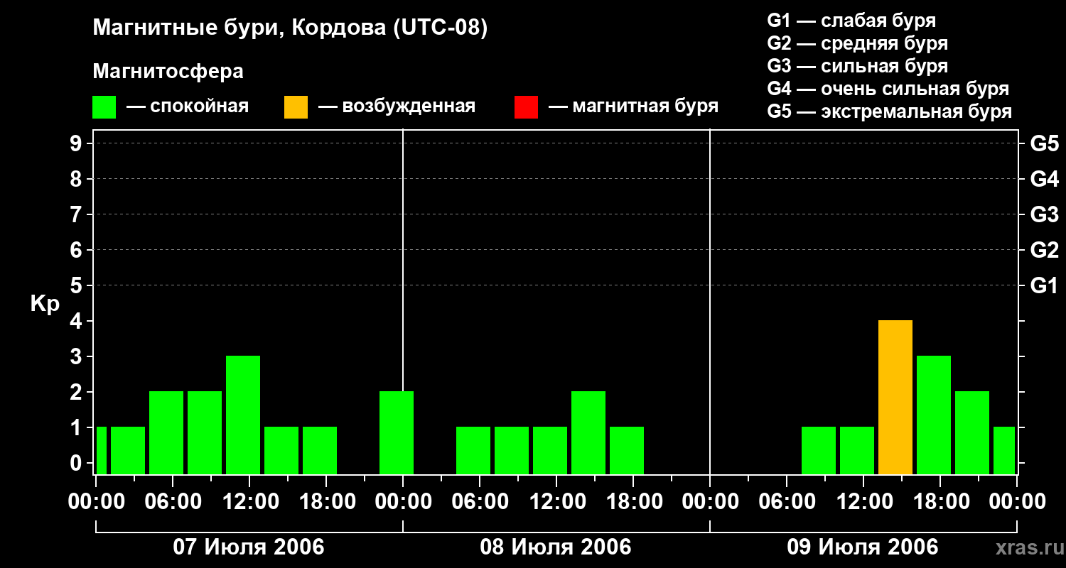 Изменения геомагнитного индекса Kp с 7 по 9 июля 2006 года для средних широт