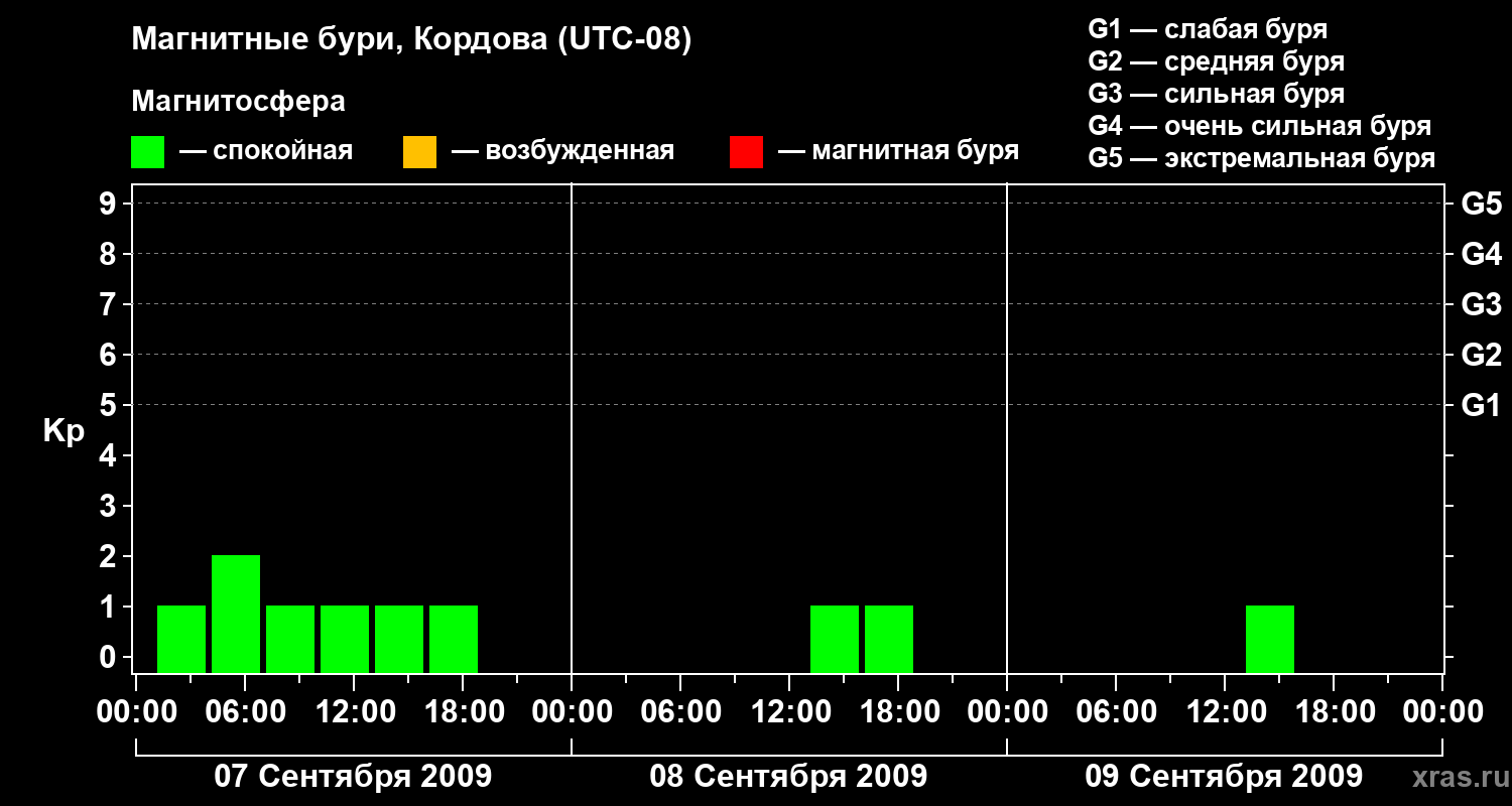 Изменения геомагнитного индекса Kp с 7 по 9 сентября 2009 года для средних широт