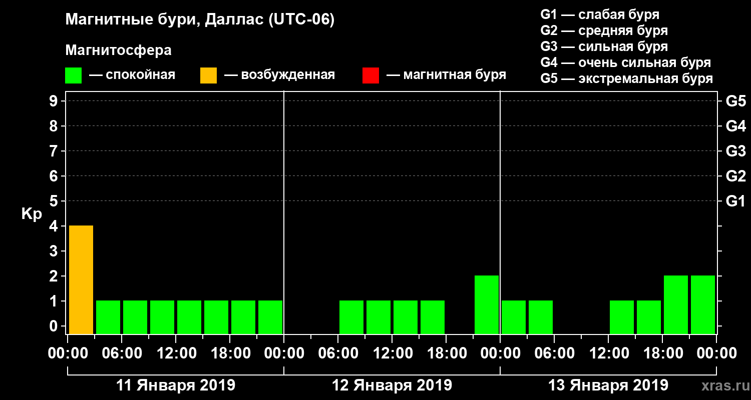 Изменения геомагнитного индекса Kp с 11 по 13 января 2019 года для средних широт