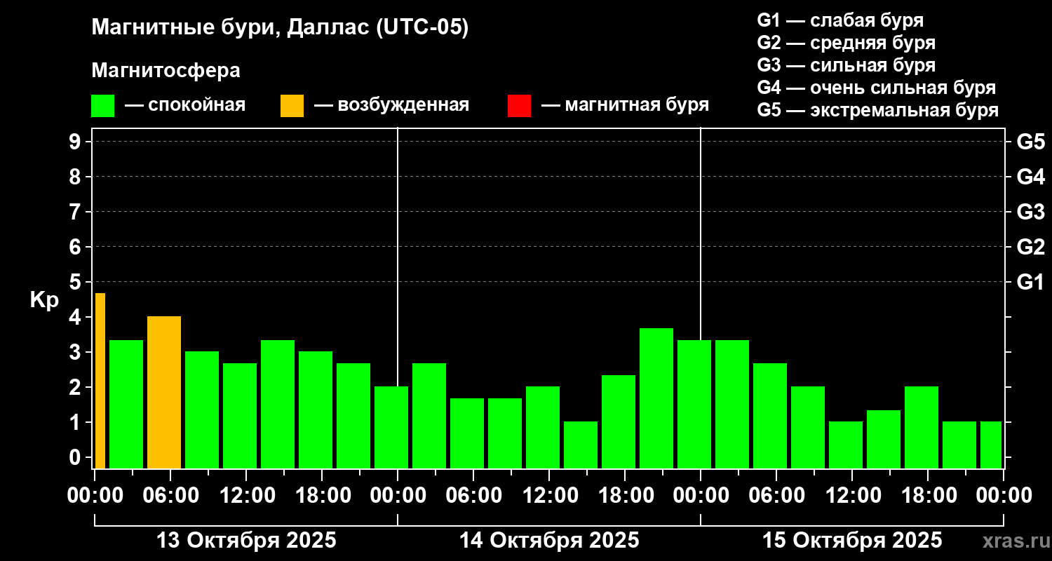 Изменения геомагнитного индекса Kp с 13 по 15 октября 2025 года для средних широт