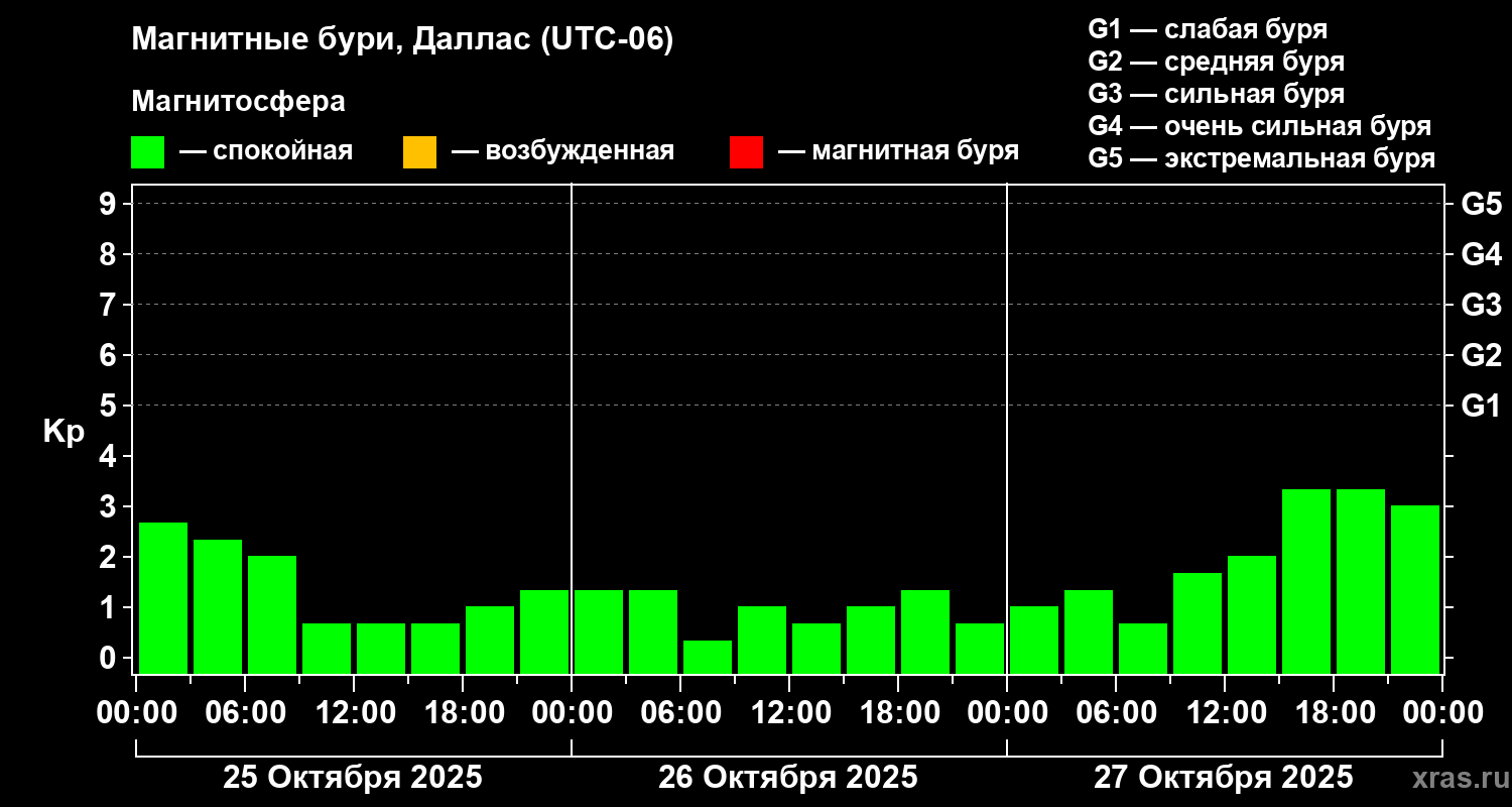 Изменения геомагнитного индекса Kp с 25 по 27 октября 2025 года для средних широт