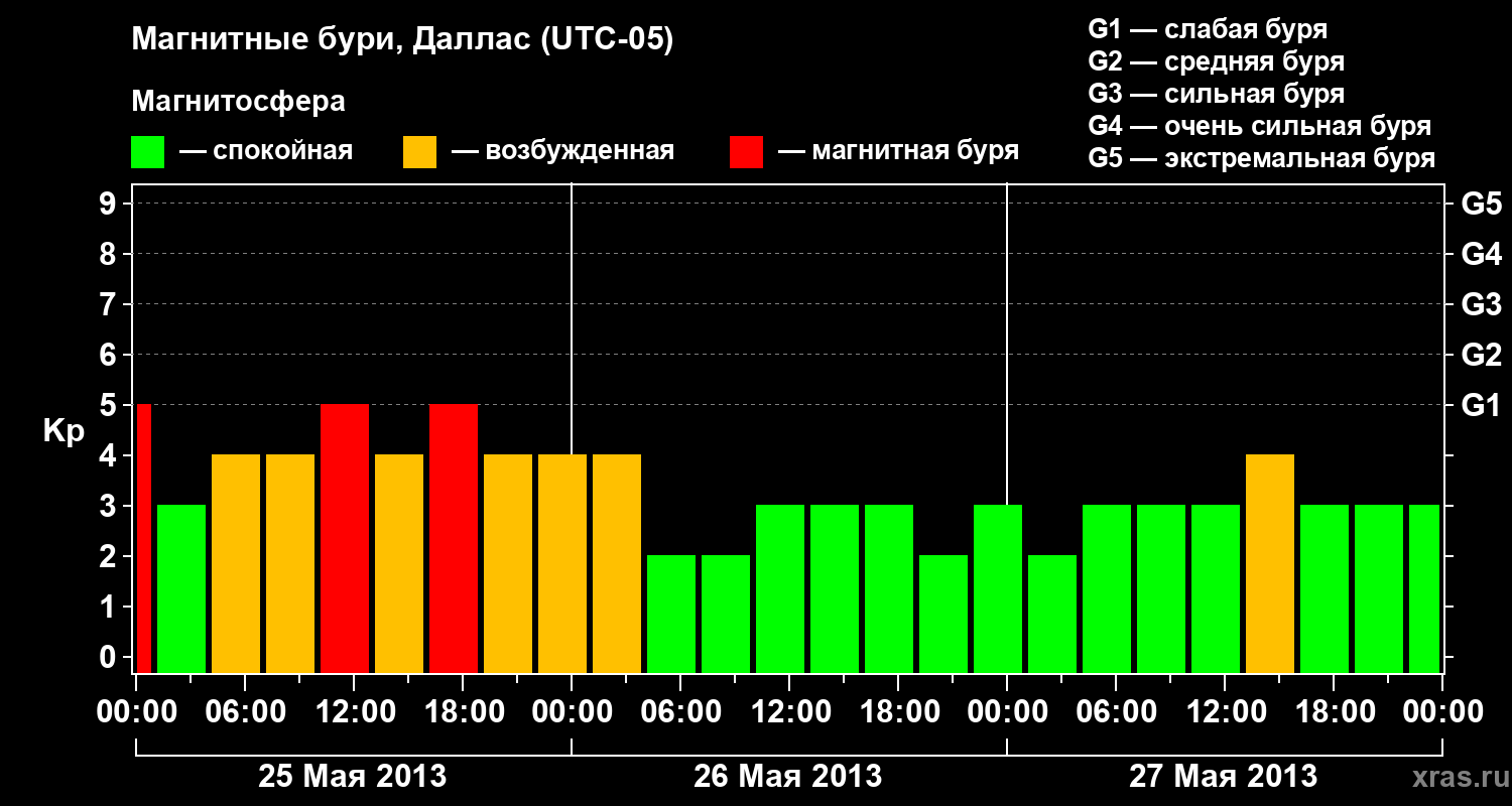 Изменения геомагнитного индекса Kp с 25 по 27 мая 2013 года для средних широт