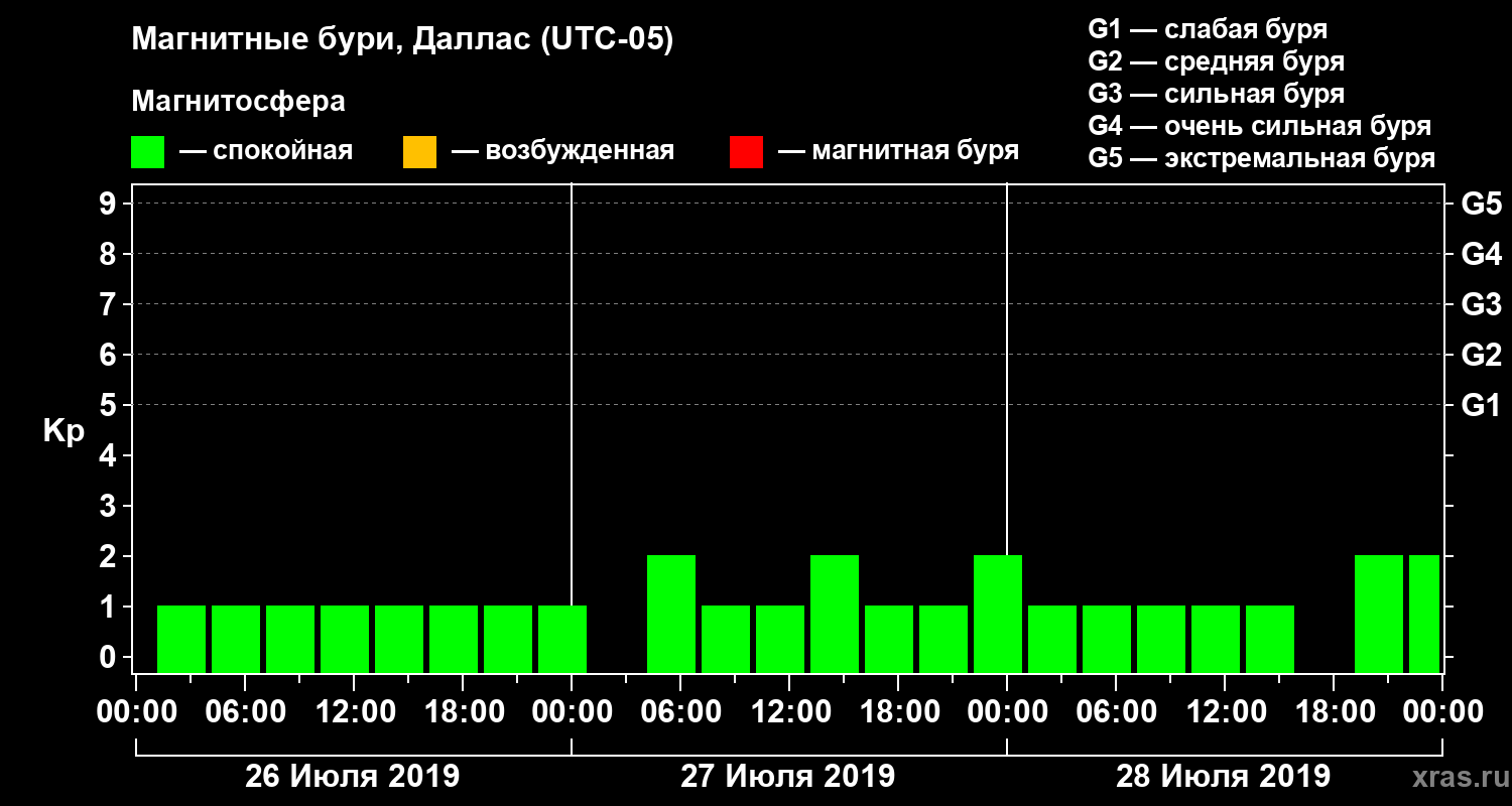 Изменения геомагнитного индекса Kp с 26 по 28 июля 2019 года для средних широт