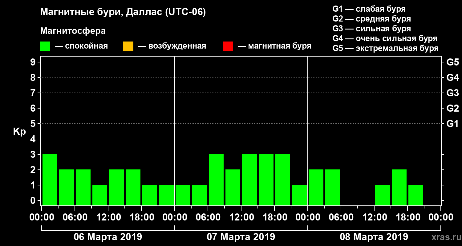 Изменения геомагнитного индекса Kp с 6 по 8 марта 2019 года для средних широт