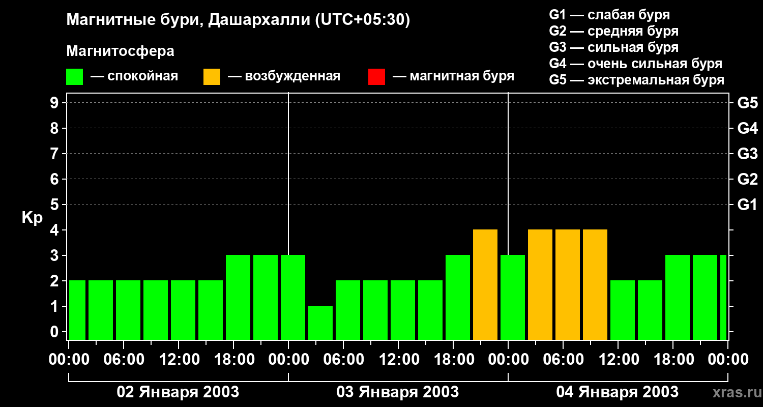 Изменения геомагнитного индекса Kp с 2 по 4 января 2003 года для средних широт