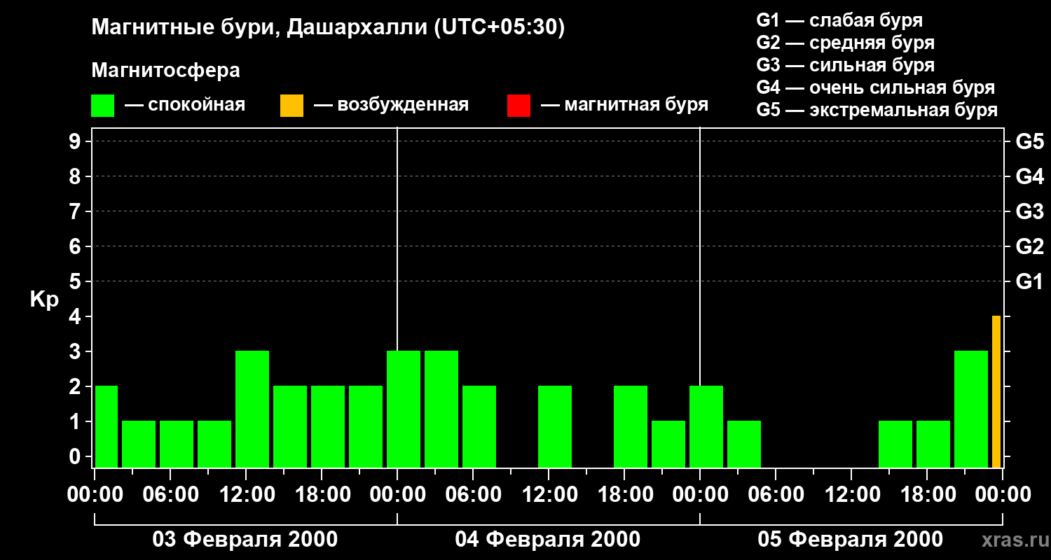 Изменения геомагнитного индекса Kp с 3 по 5 февраля 2000 года для средних широт