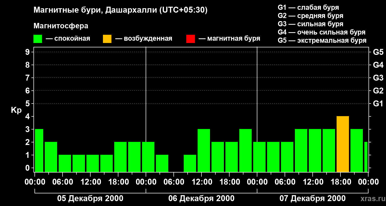Изменения геомагнитного индекса Kp с 5 по 7 декабря 2000 года для средних широт