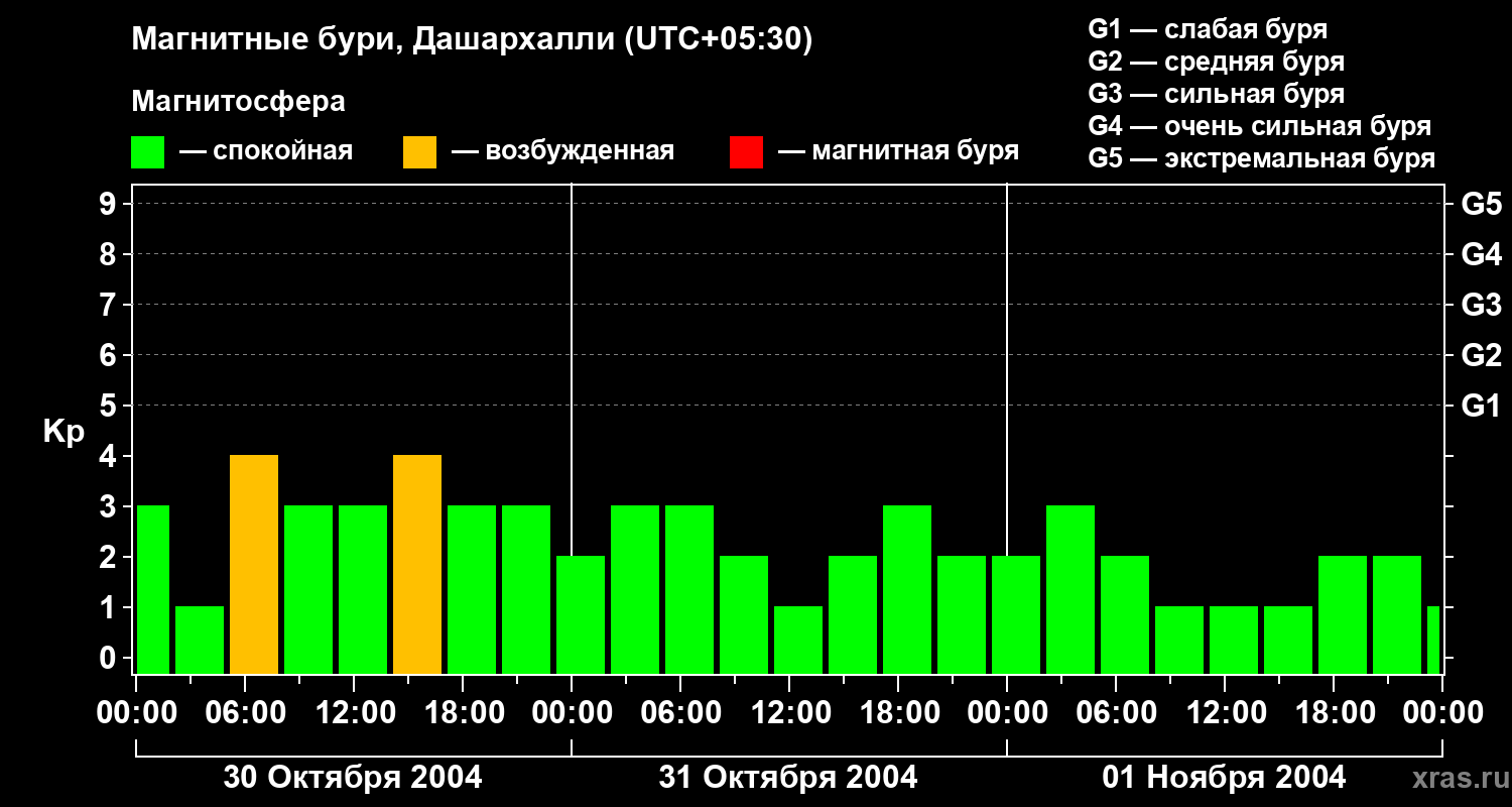 Изменения геомагнитного индекса Kp с 30 октября по 1 ноября 2004 года для средних широт
