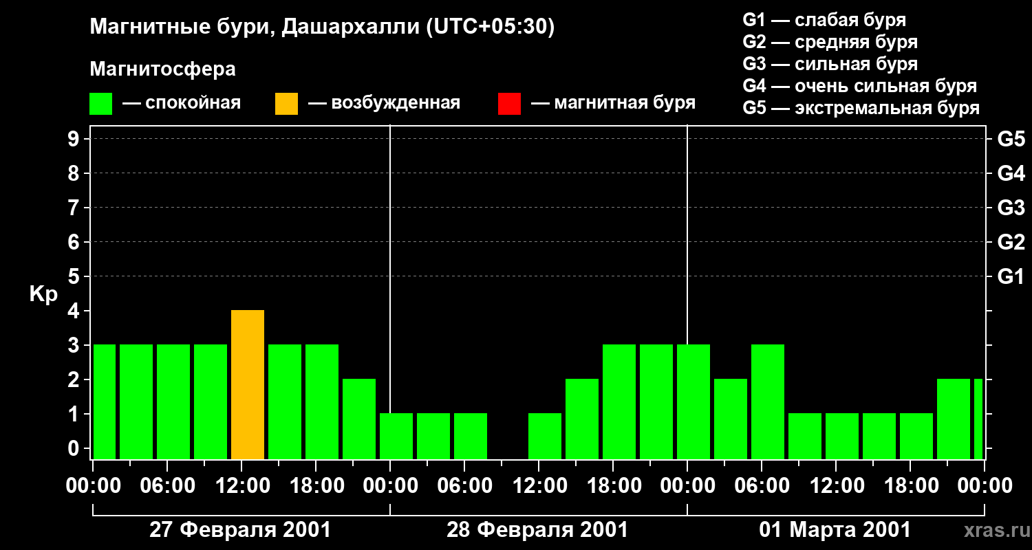 Изменения геомагнитного индекса Kp с 27 февраля по 1 марта 2001 года для средних широт