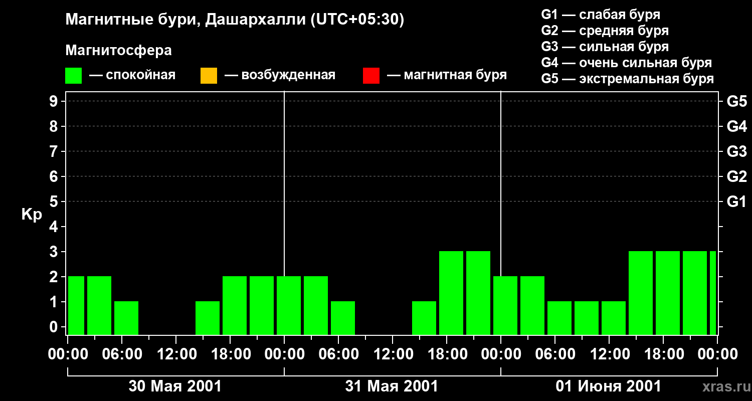 Изменения геомагнитного индекса Kp с 30 мая по 1 июня 2001 года для средних широт