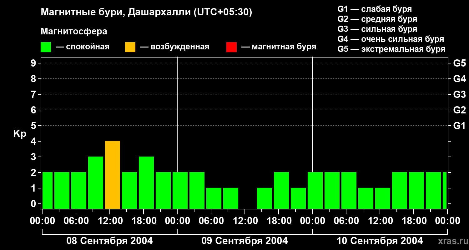 Изменения геомагнитного индекса Kp с 8 по 10 сентября 2004 года для средних широт