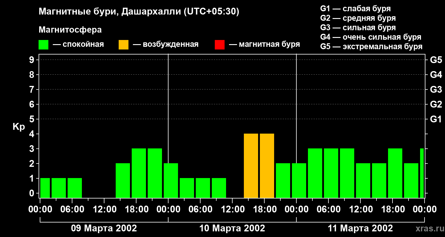 Изменения геомагнитного индекса Kp с 9 по 11 марта 2002 года для средних широт