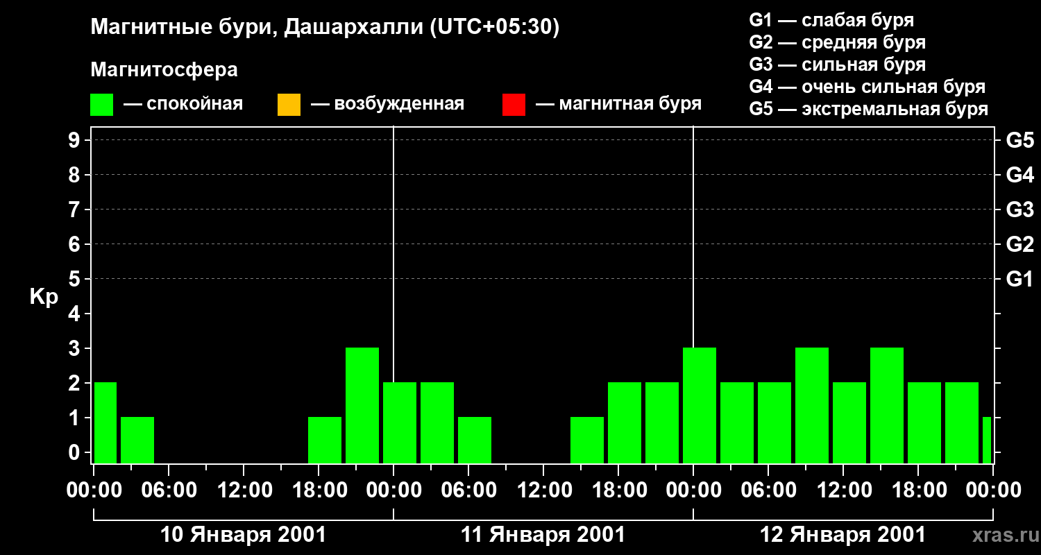 Изменения геомагнитного индекса Kp с 10 по 12 января 2001 года для средних широт