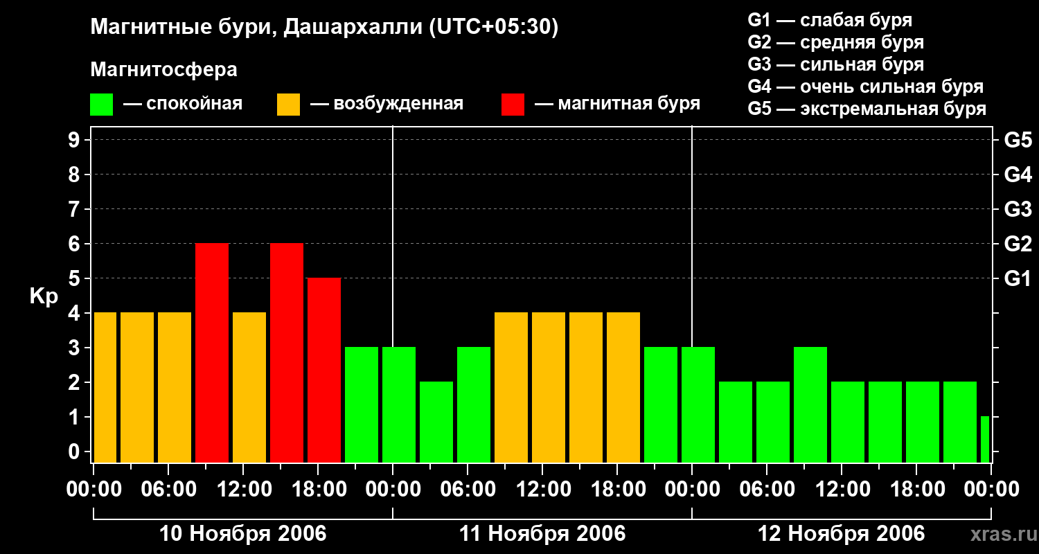Изменения геомагнитного индекса Kp с 10 по 12 ноября 2006 года для средних широт