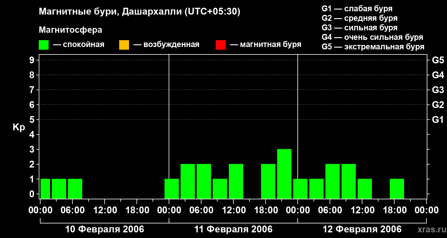 Изменения геомагнитного индекса Kp с 10 по 12 февраля 2006 года для средних широт