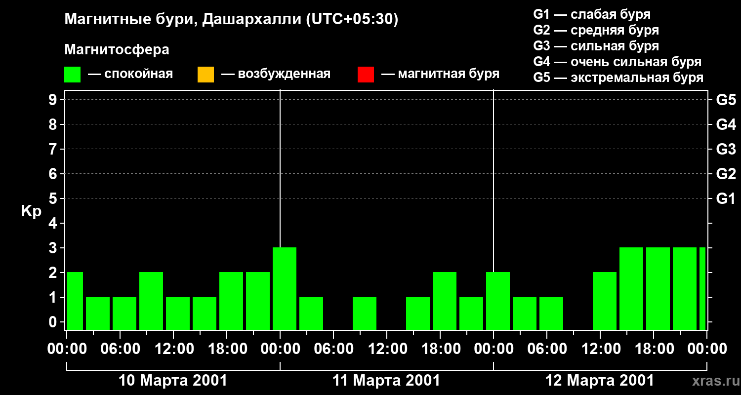 Изменения геомагнитного индекса Kp с 10 по 12 марта 2001 года для средних широт