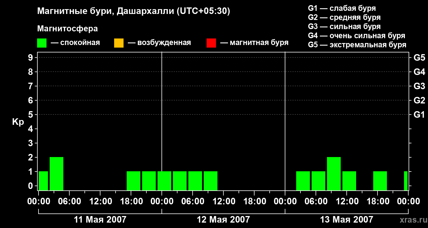Изменения геомагнитного индекса Kp с 11 по 13 мая 2007 года для средних широт