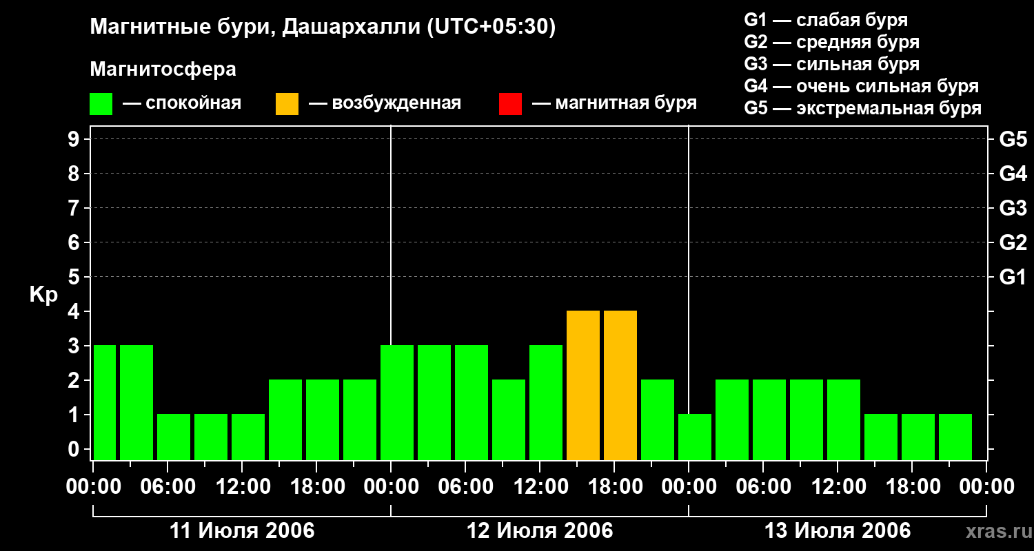Изменения геомагнитного индекса Kp с 11 по 13 июля 2006 года для средних широт