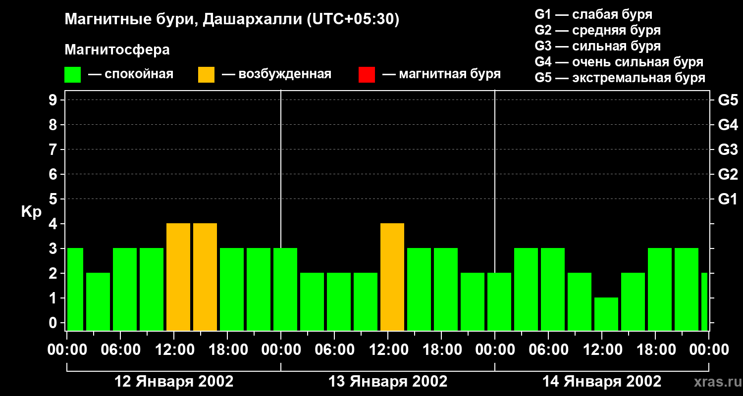 Изменения геомагнитного индекса Kp с 12 по 14 января 2002 года для средних широт
