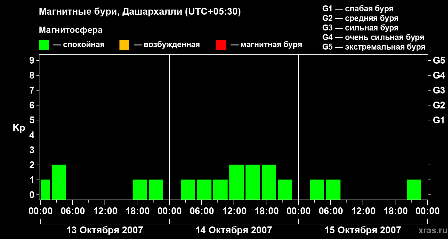 Изменения геомагнитного индекса Kp с 13 по 15 октября 2007 года для средних широт