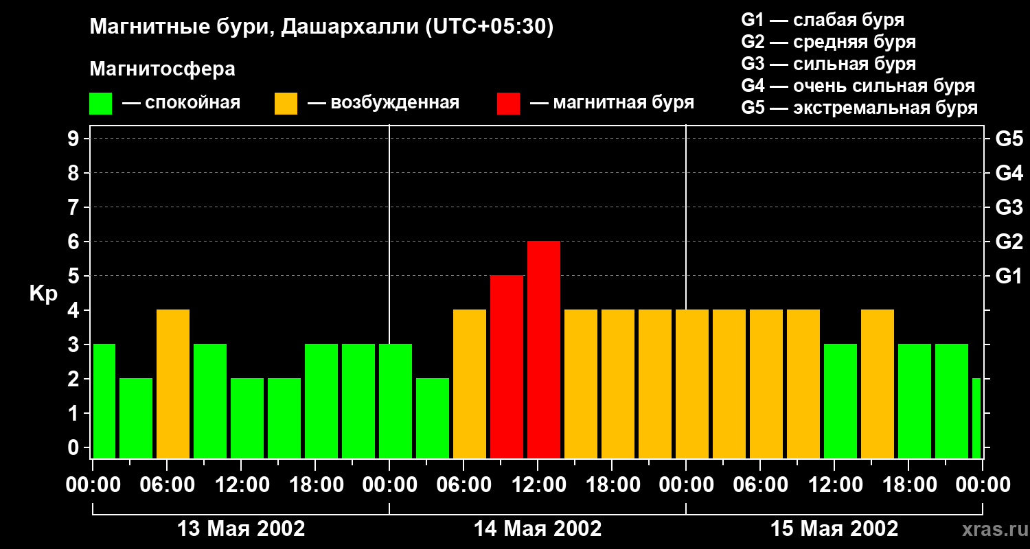 Изменения геомагнитного индекса Kp с 13 по 15 мая 2002 года для средних широт
