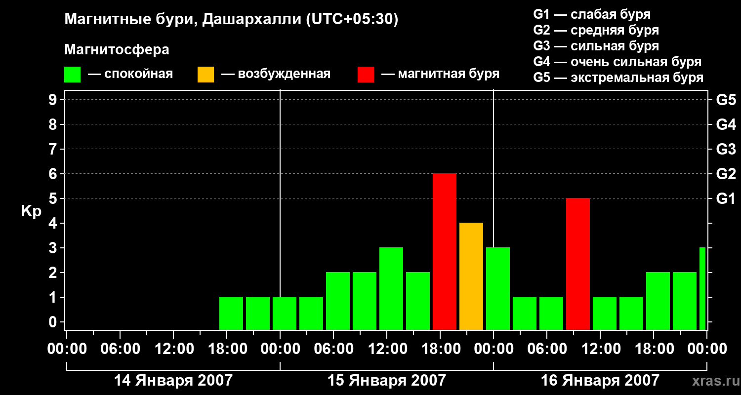 Изменения геомагнитного индекса Kp с 14 по 16 января 2007 года для средних широт