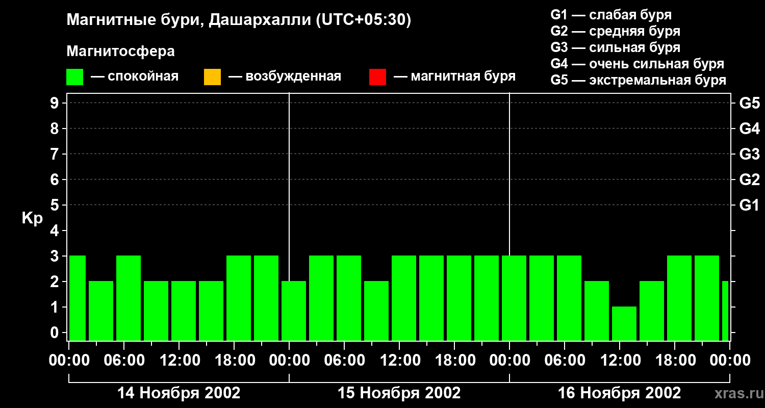 Изменения геомагнитного индекса Kp с 14 по 16 ноября 2002 года для средних широт