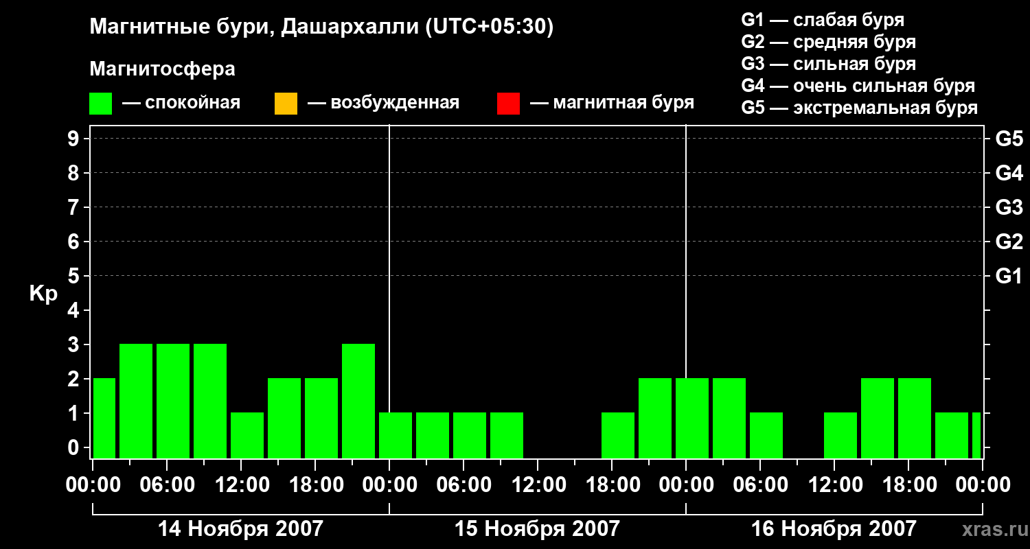 Изменения геомагнитного индекса Kp с 14 по 16 ноября 2007 года для средних широт