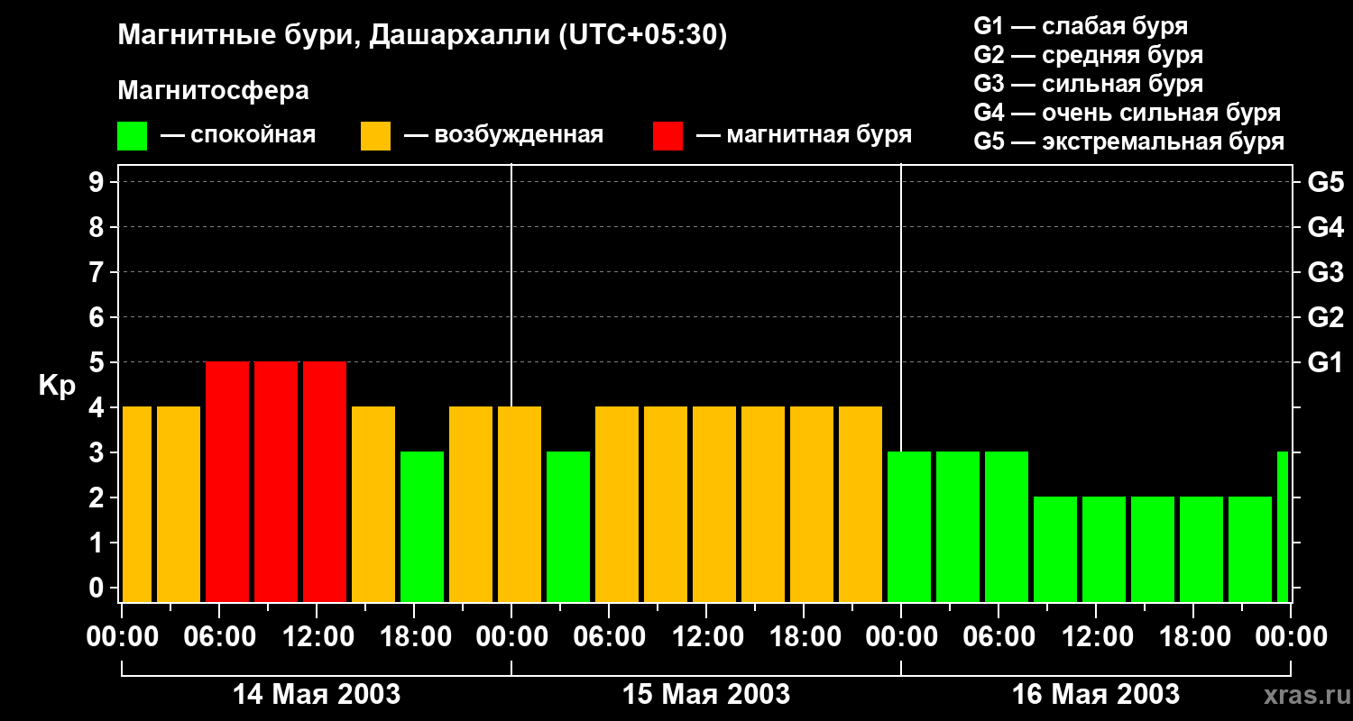 Изменения геомагнитного индекса Kp с 14 по 16 мая 2003 года для средних широт