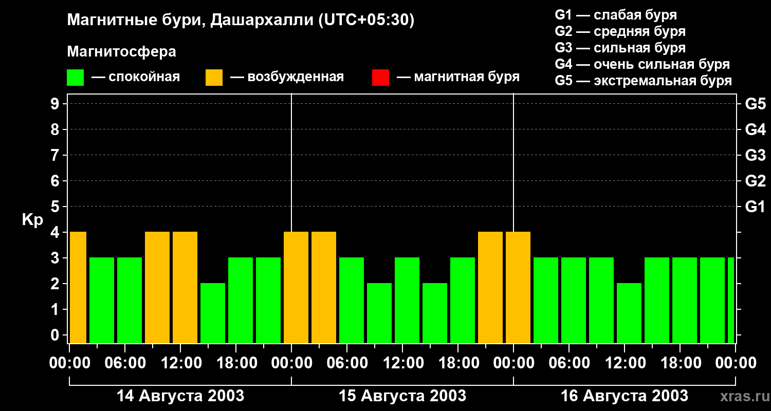 Изменения геомагнитного индекса Kp с 14 по 16 августа 2003 года для средних широт