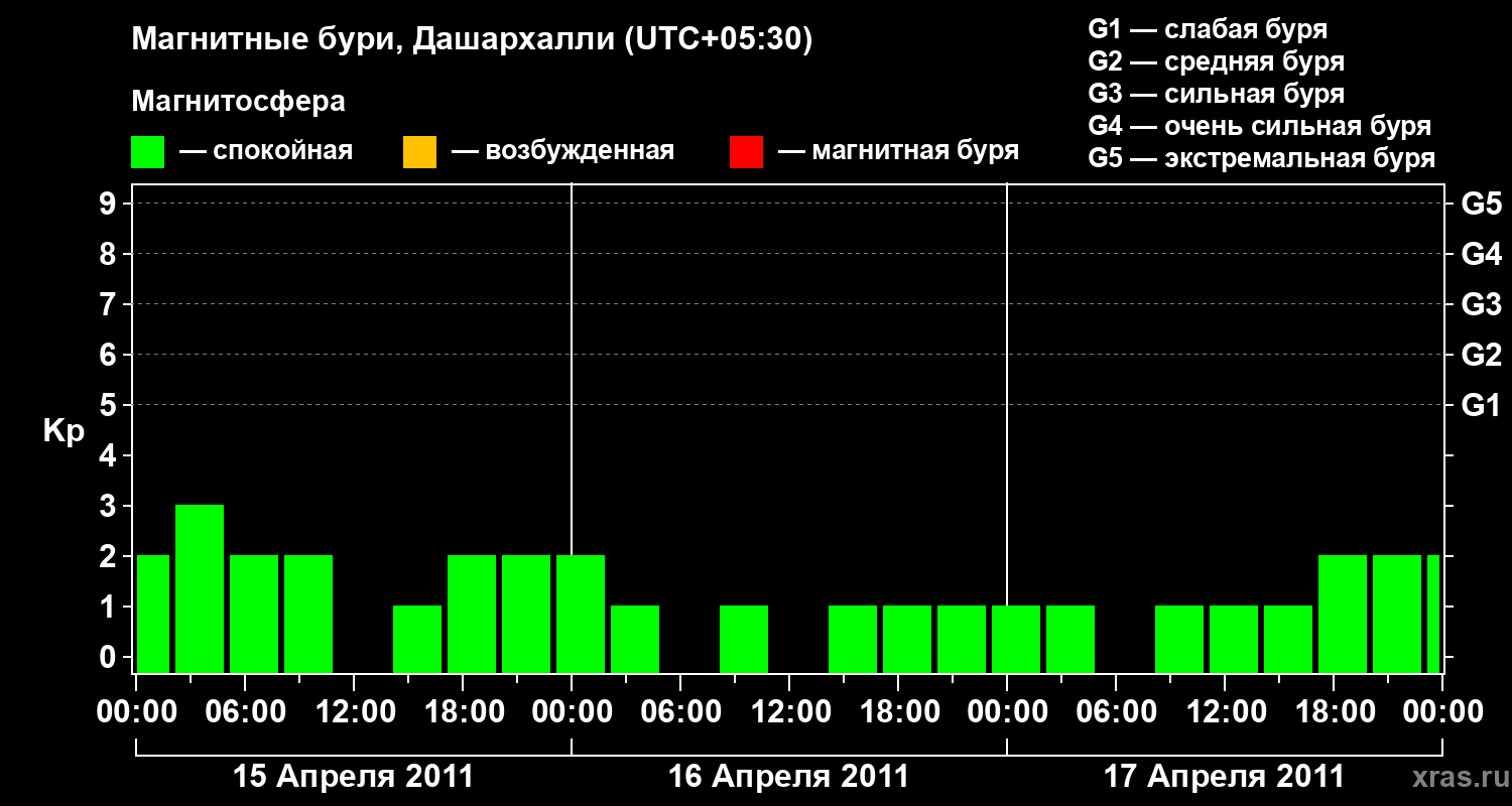 Изменения геомагнитного индекса Kp с 15 по 17 апреля 2011 года для средних широт