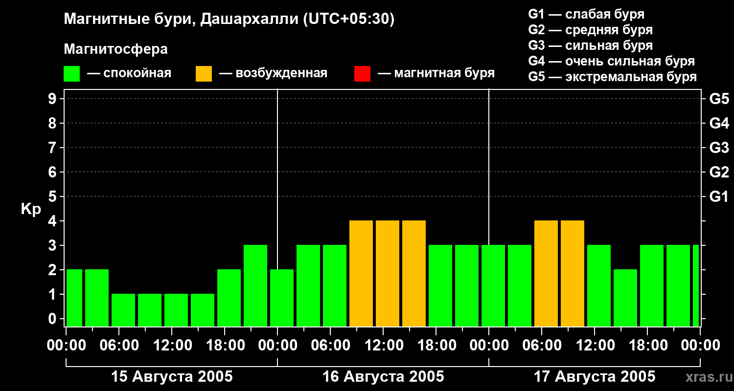 Изменения геомагнитного индекса Kp с 15 по 17 августа 2005 года для средних широт