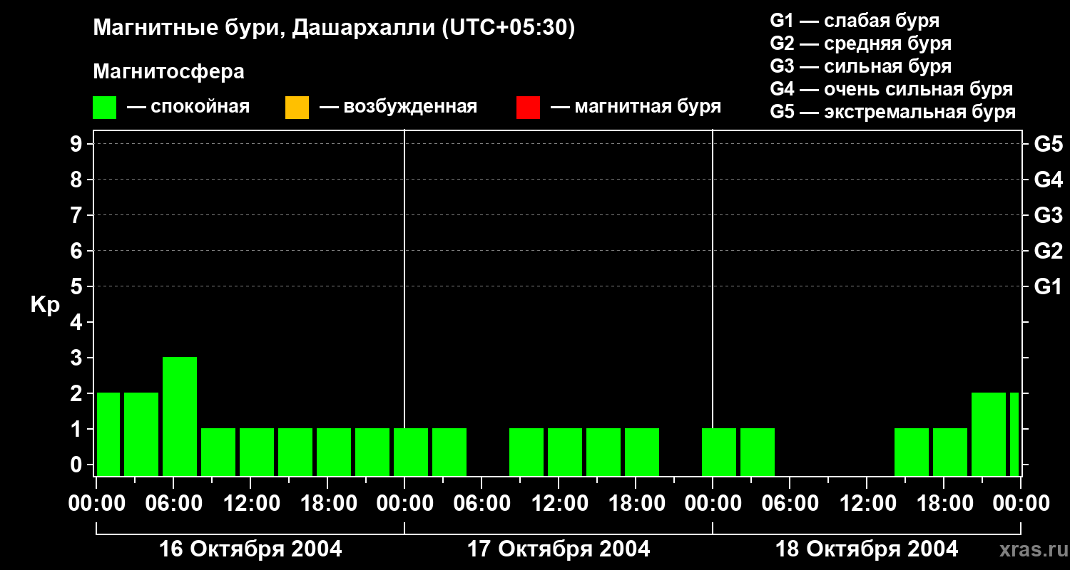 Изменения геомагнитного индекса Kp с 16 по 18 октября 2004 года для средних широт