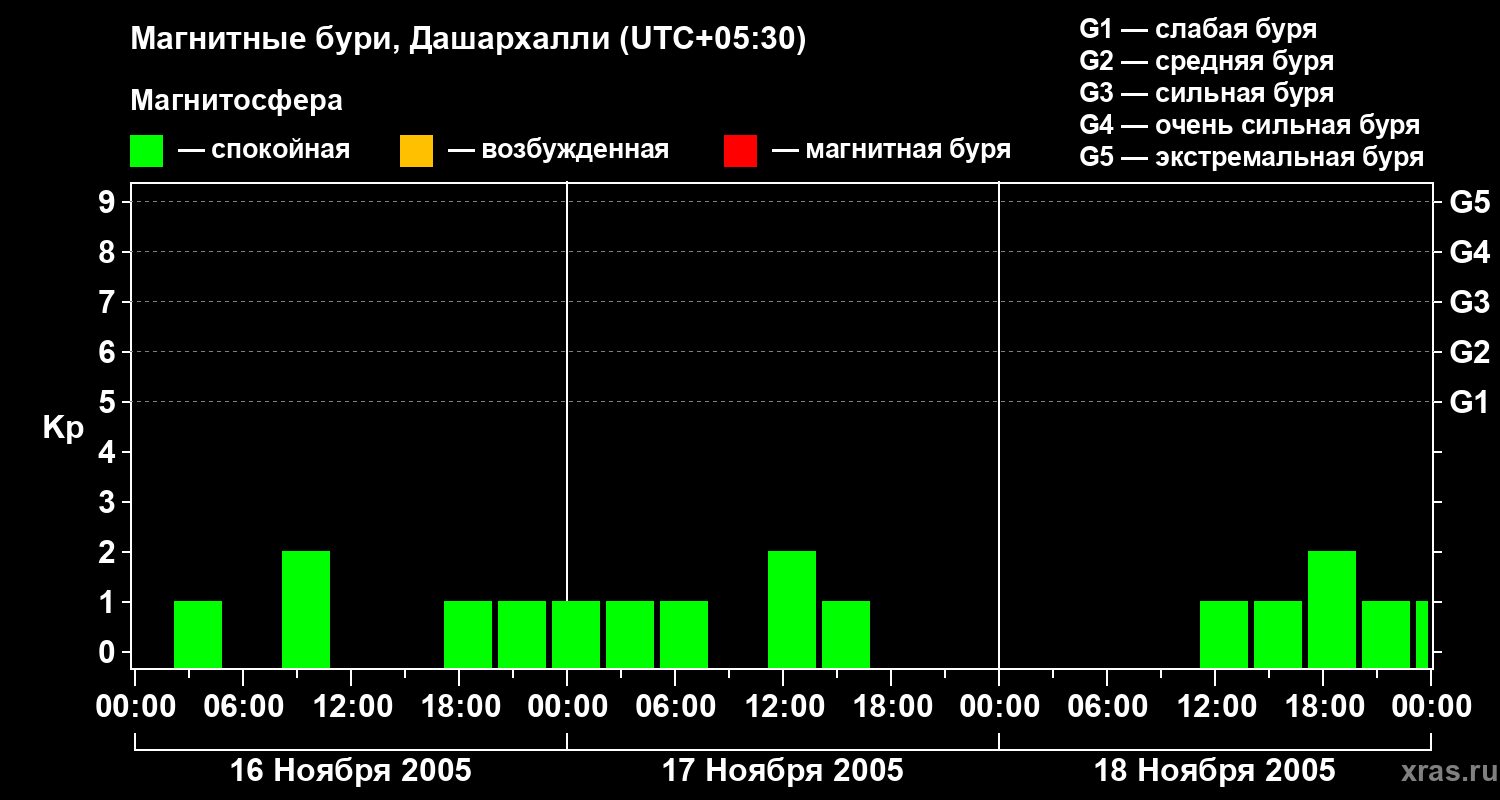 Изменения геомагнитного индекса Kp с 16 по 18 ноября 2005 года для средних широт
