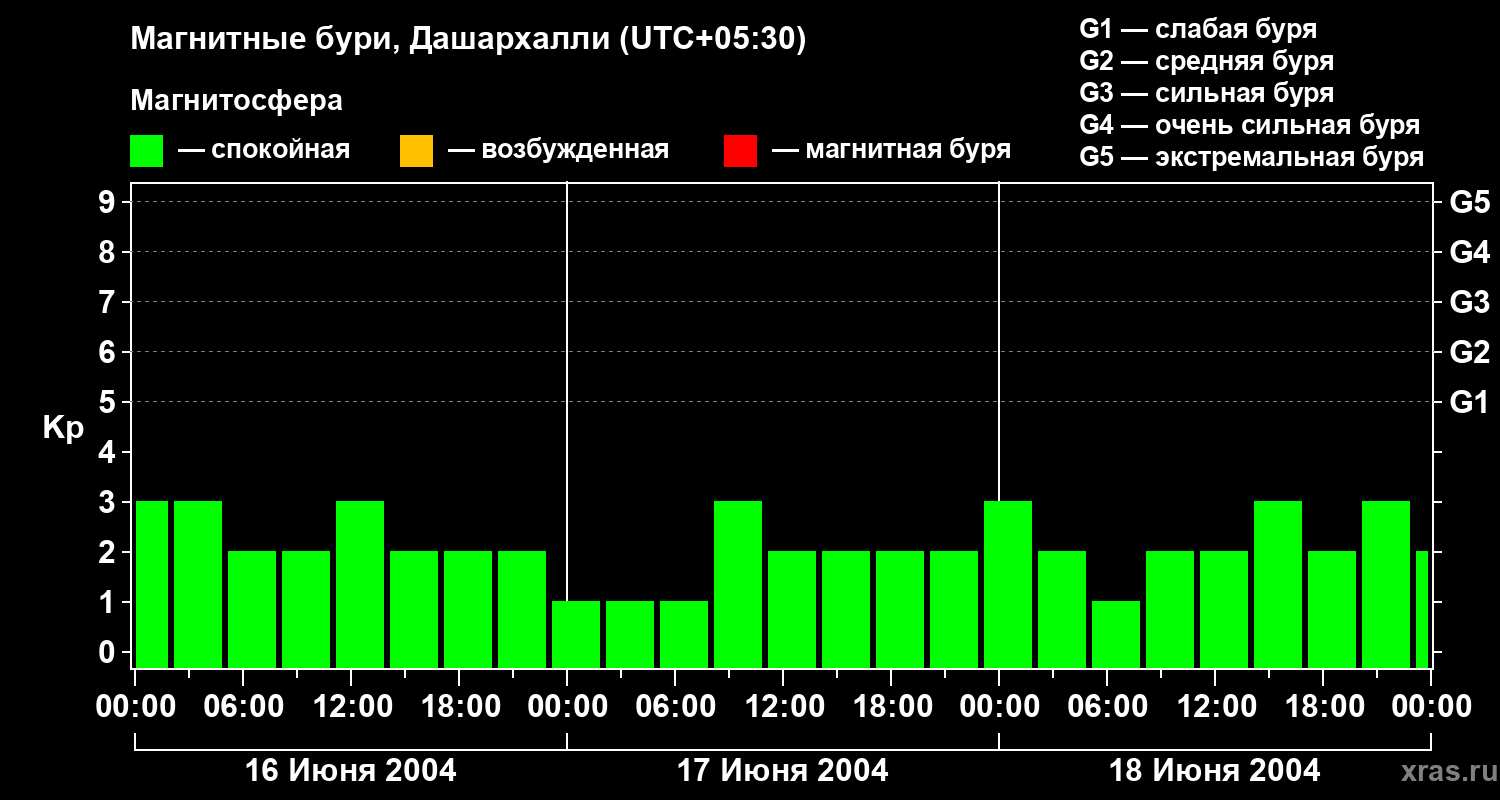 Изменения геомагнитного индекса Kp с 16 по 18 июня 2004 года для средних широт