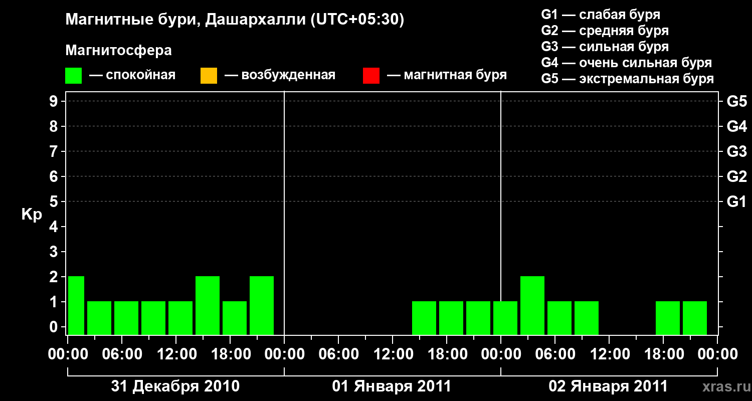 Изменения геомагнитного индекса Kp с 31 декабря 2010 года по 2 января 2011 года для средних широт
