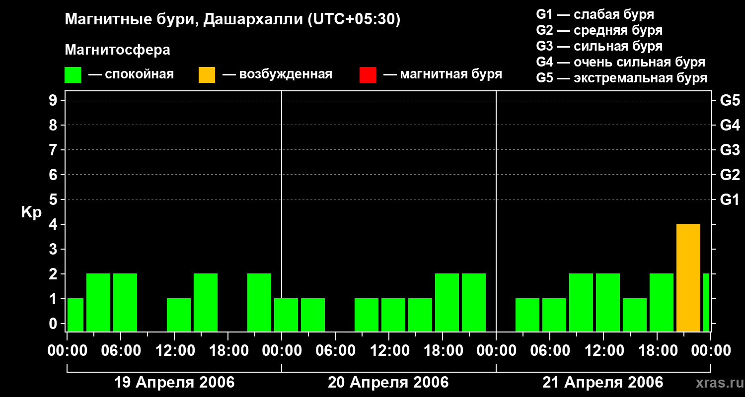 Изменения геомагнитного индекса Kp с 19 по 21 апреля 2006 года для средних широт