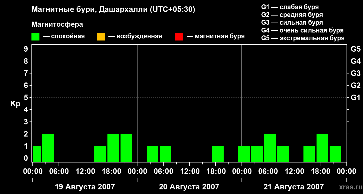 Изменения геомагнитного индекса Kp с 19 по 21 августа 2007 года для средних широт