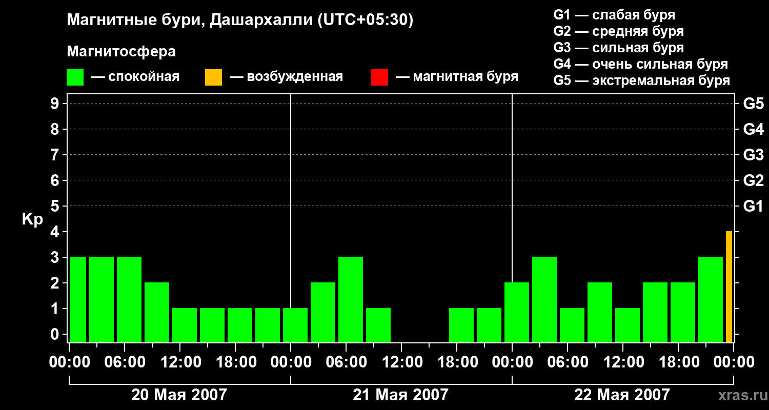 Изменения геомагнитного индекса Kp с 20 по 22 мая 2007 года для средних широт