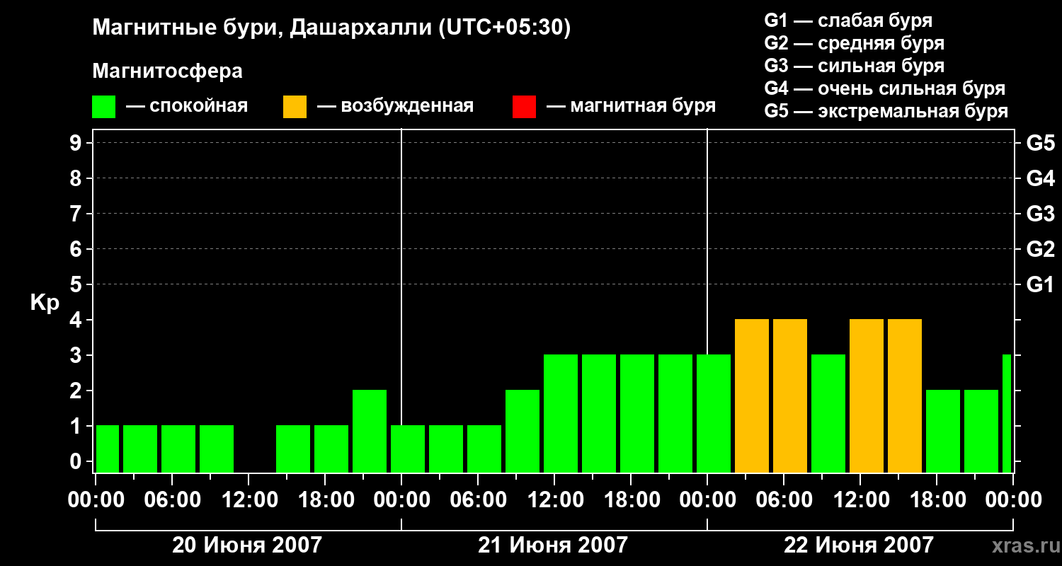 Изменения геомагнитного индекса Kp с 20 по 22 июня 2007 года для средних широт