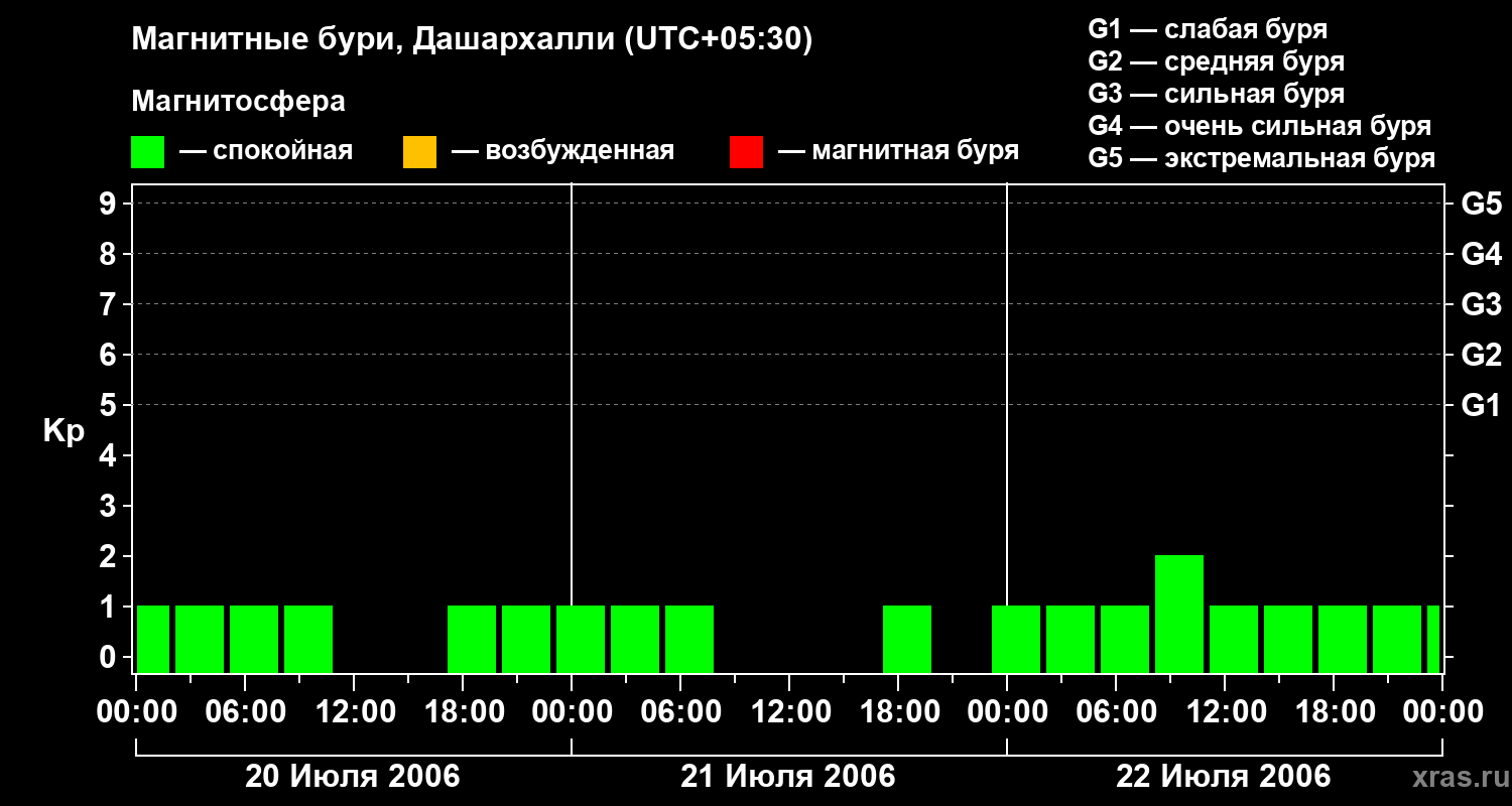 Изменения геомагнитного индекса Kp с 20 по 22 июля 2006 года для средних широт