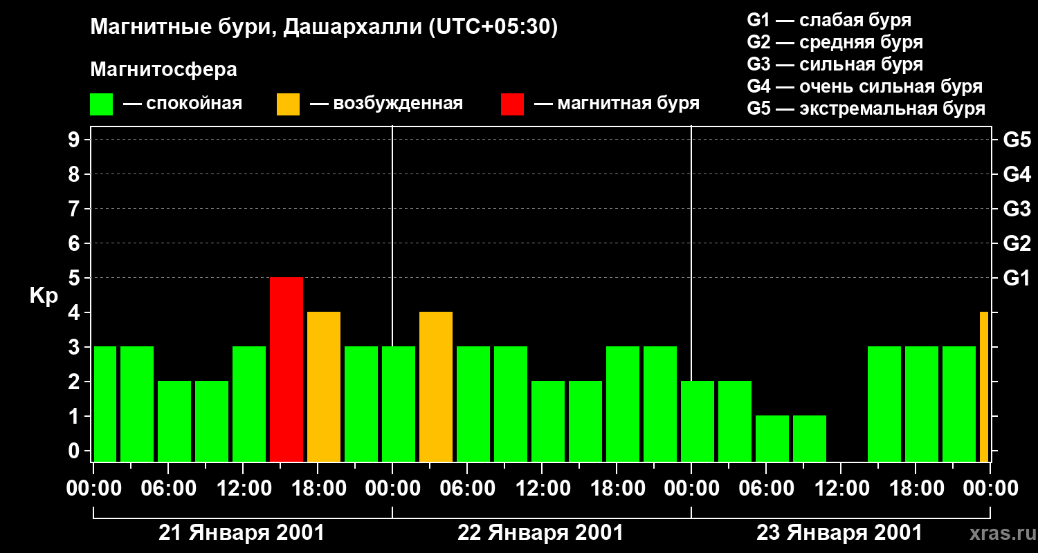 Изменения геомагнитного индекса Kp с 21 по 23 января 2001 года для средних широт