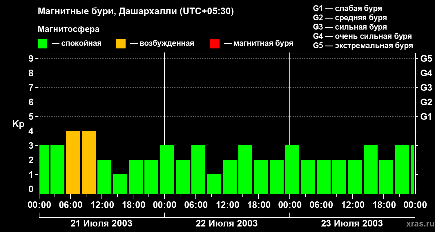 Изменения геомагнитного индекса Kp с 21 по 23 июля 2003 года для средних широт