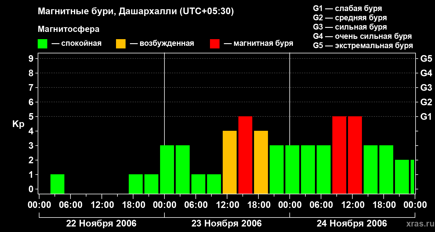 Изменения геомагнитного индекса Kp с 22 по 24 ноября 2006 года для средних широт