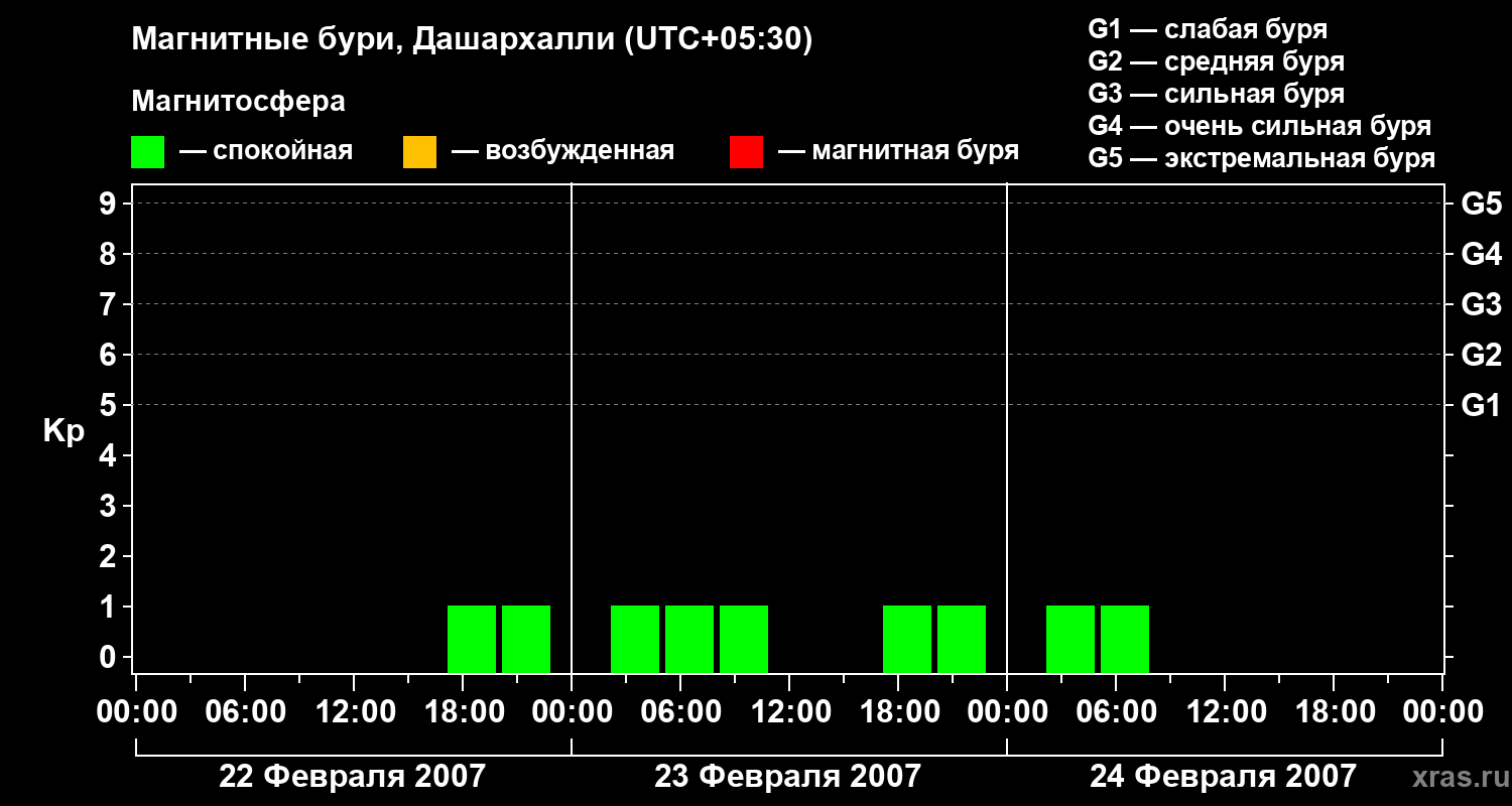 Изменения геомагнитного индекса Kp с 22 по 24 февраля 2007 года для средних широт