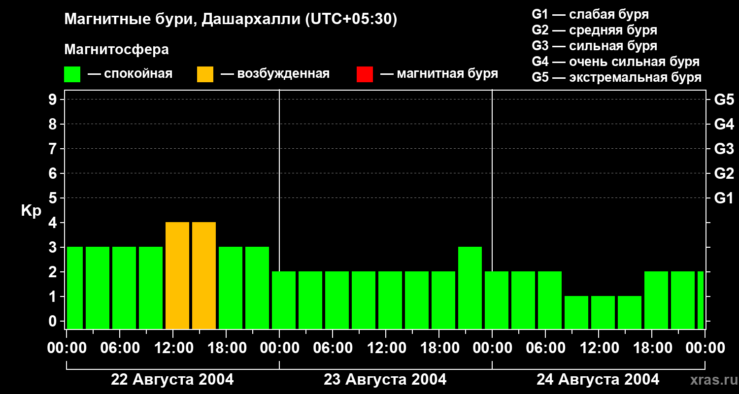 Изменения геомагнитного индекса Kp с 22 по 24 августа 2004 года для средних широт