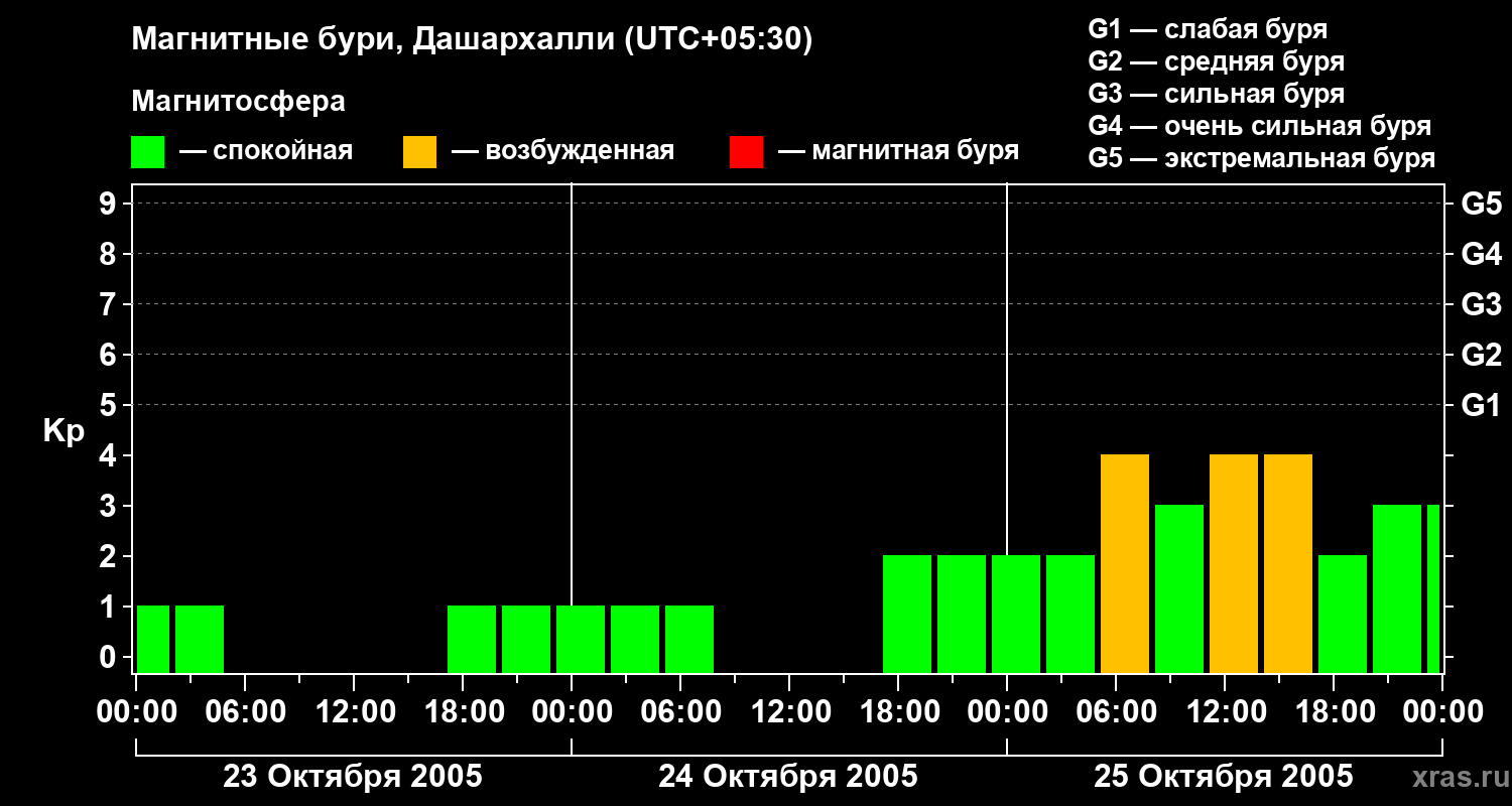 Изменения геомагнитного индекса Kp с 23 по 25 октября 2005 года для средних широт