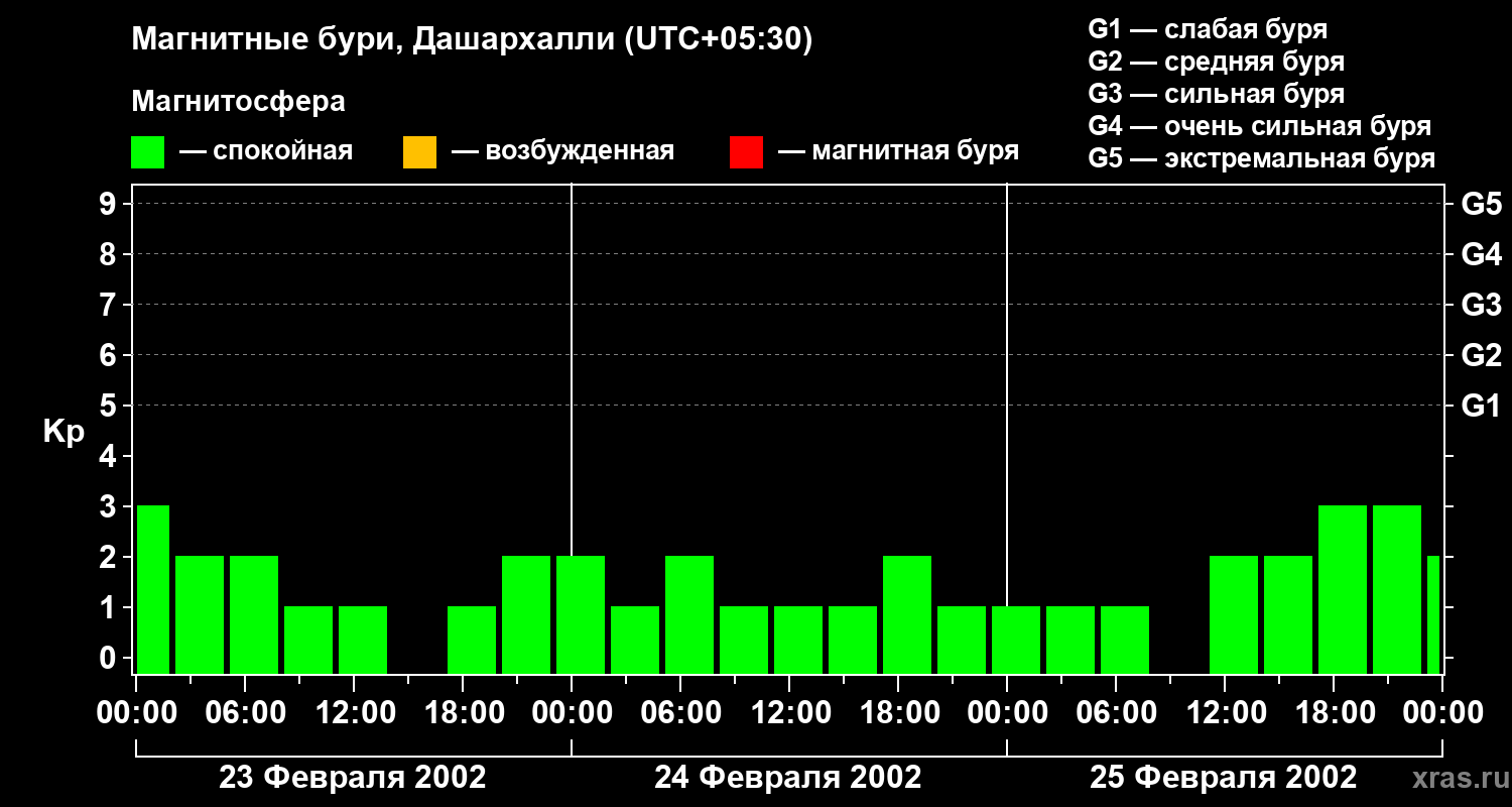 Изменения геомагнитного индекса Kp с 23 по 25 февраля 2002 года для средних широт