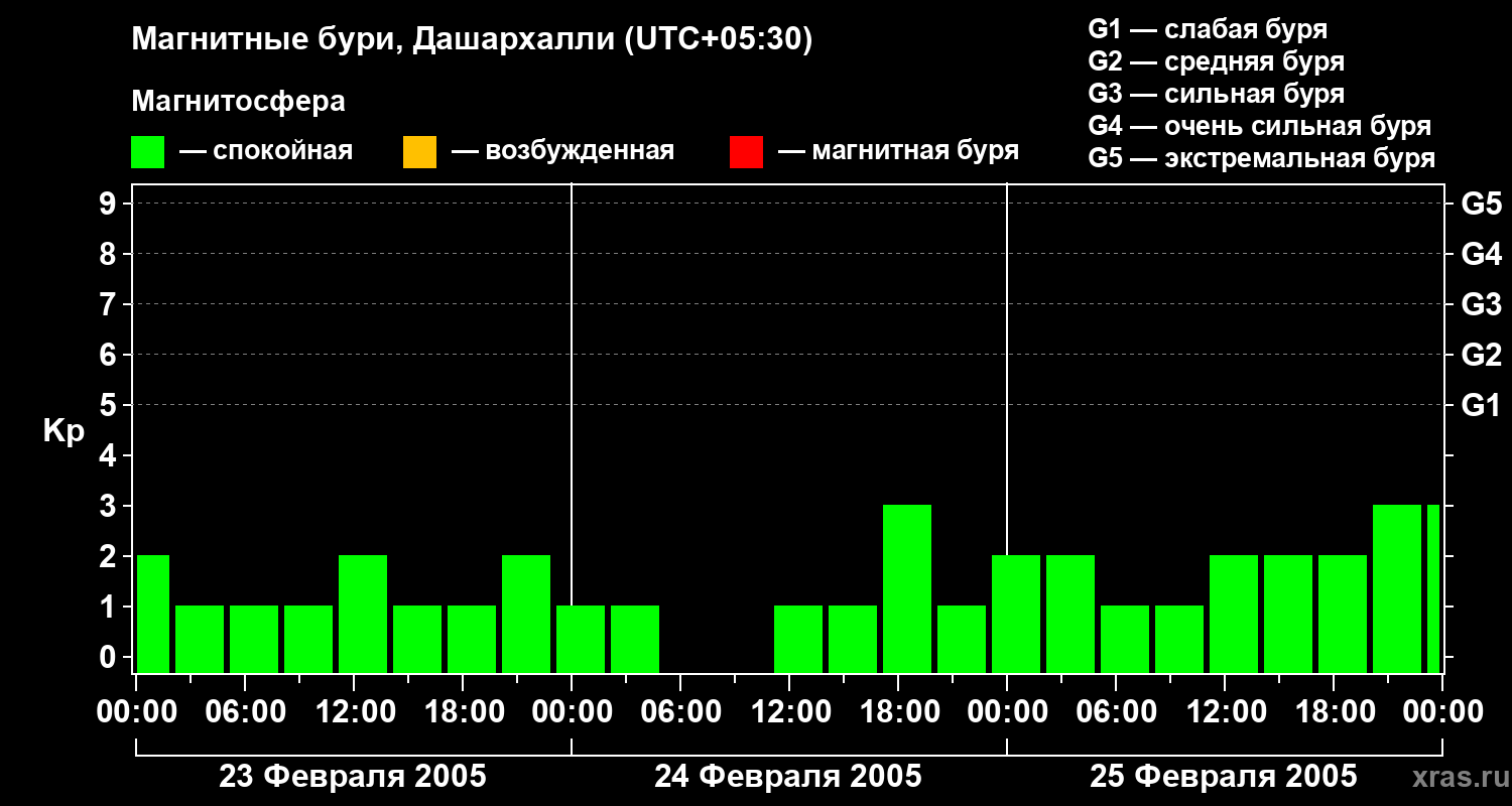 Изменения геомагнитного индекса Kp с 23 по 25 февраля 2005 года для средних широт