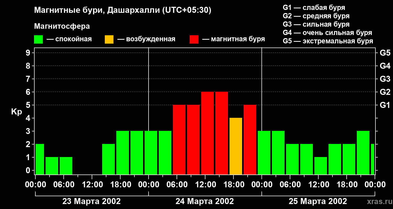 Изменения геомагнитного индекса Kp с 23 по 25 марта 2002 года для средних широт